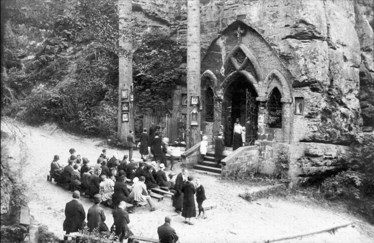 Takto vypadá skalní kaple Modlivého dolu. Dějí se v ní skutečně zázraky? Historická pohlednice zachycuje bohoslužbu v roce 1914. Došlo tu tehdy také k nějakému uzdravení? Vnitřek skalní kaple je upraven tak, aby připomínal slavné Lurdy. Jak je to se zázraky na obou těchto místech?