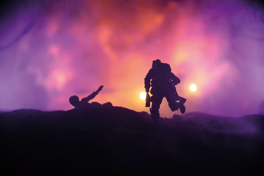 Dva vojáci se krčí v zákopech a usilovně se modlí. Jsou pod palbou nepřátel a nemají, kam by utekli. Modlitby ale nefungují, protože je vzápětí zasáhne granát a svět kolem nich exploduje.